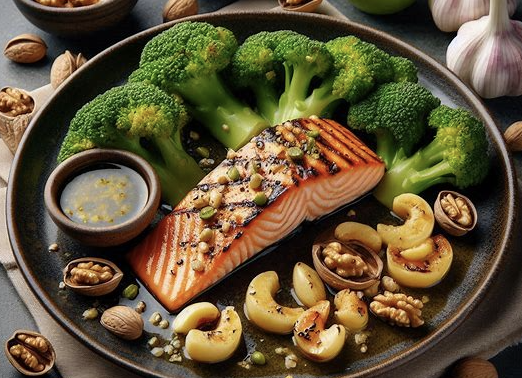 • 점심: 브로콜리와 연어 구이, 마늘 소스 곁들임