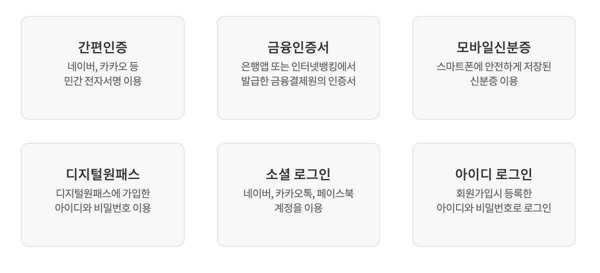 ✅ 본인 인증: 휴대폰, 공공아이핀, 또는 공동인증서로 본인 인증을 진행합니다. 14세 미만은 보호자 동의가 필요합니다.