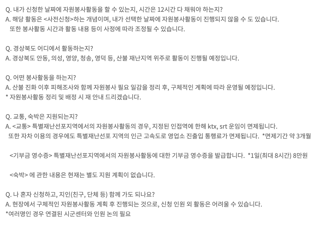 - 문제 원인: 산불 피해 지역 봉사와 관련해 궁금한 점이 생겼을 때 어디로 연락해야 할지 모를 수 있습니다.